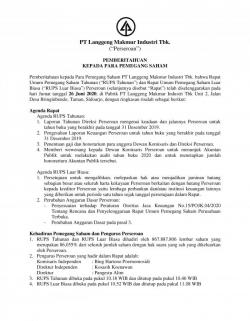 Pemberitahuan kepada Para Pemegang Saham PT Langgeng Makmur Industri Tbk. bahwa Rapat Umum Pemegang Saham Tahunan (“RUPS Tahunan”) dan Rapat Umum Pemegang Saham Luar Biasa (“RUPS Luar Biasa”) Perseroan (selanjutnya disebut “Rapat”) telah diselenggarakan pada hari Jumat tanggal 26 Juni 2020, di Pabrik PT Langgeng Makmur Industri Tbk Unit 2, Jalan Desa Bringinbendo, Taman, Sidoarjo.